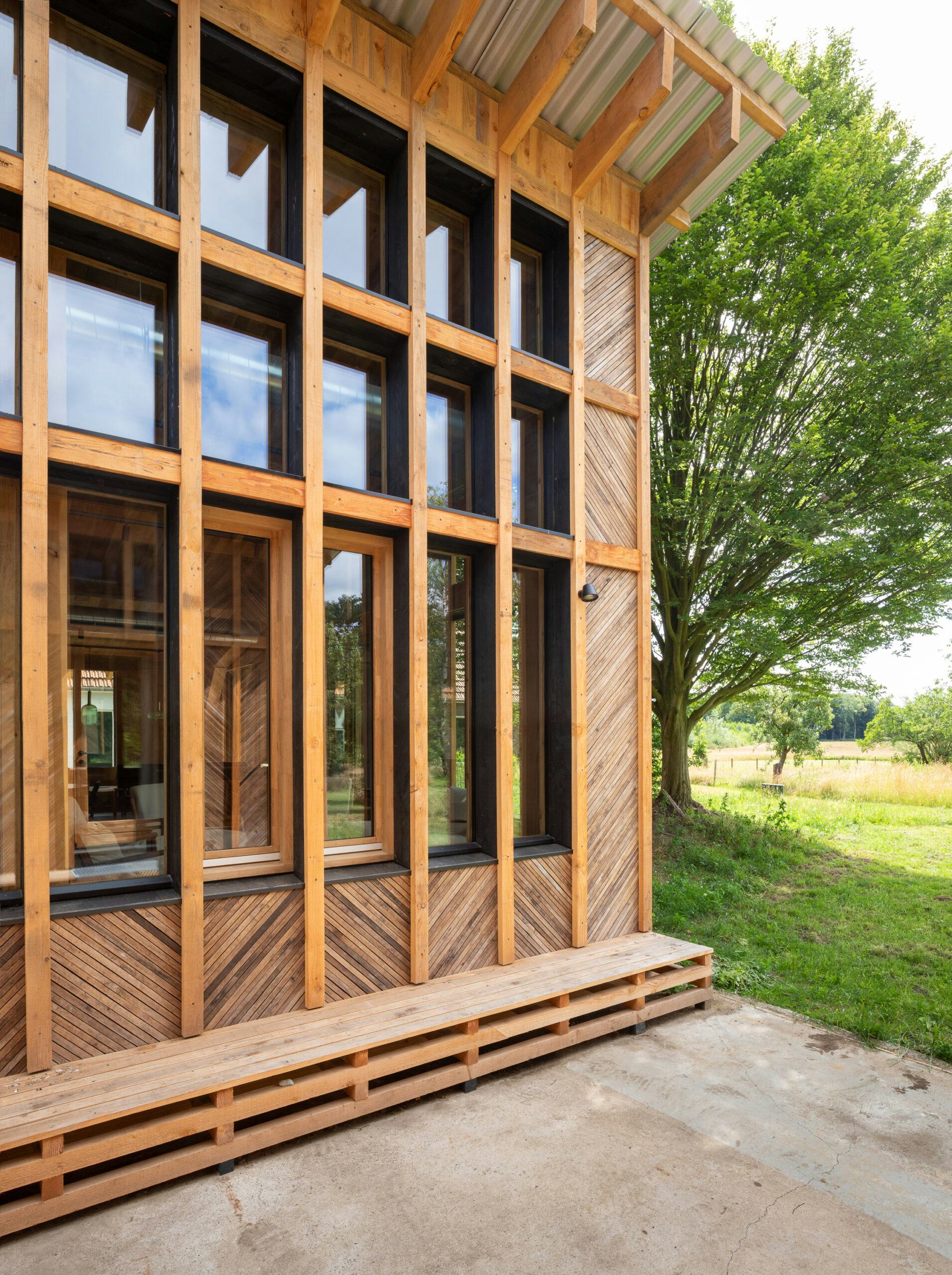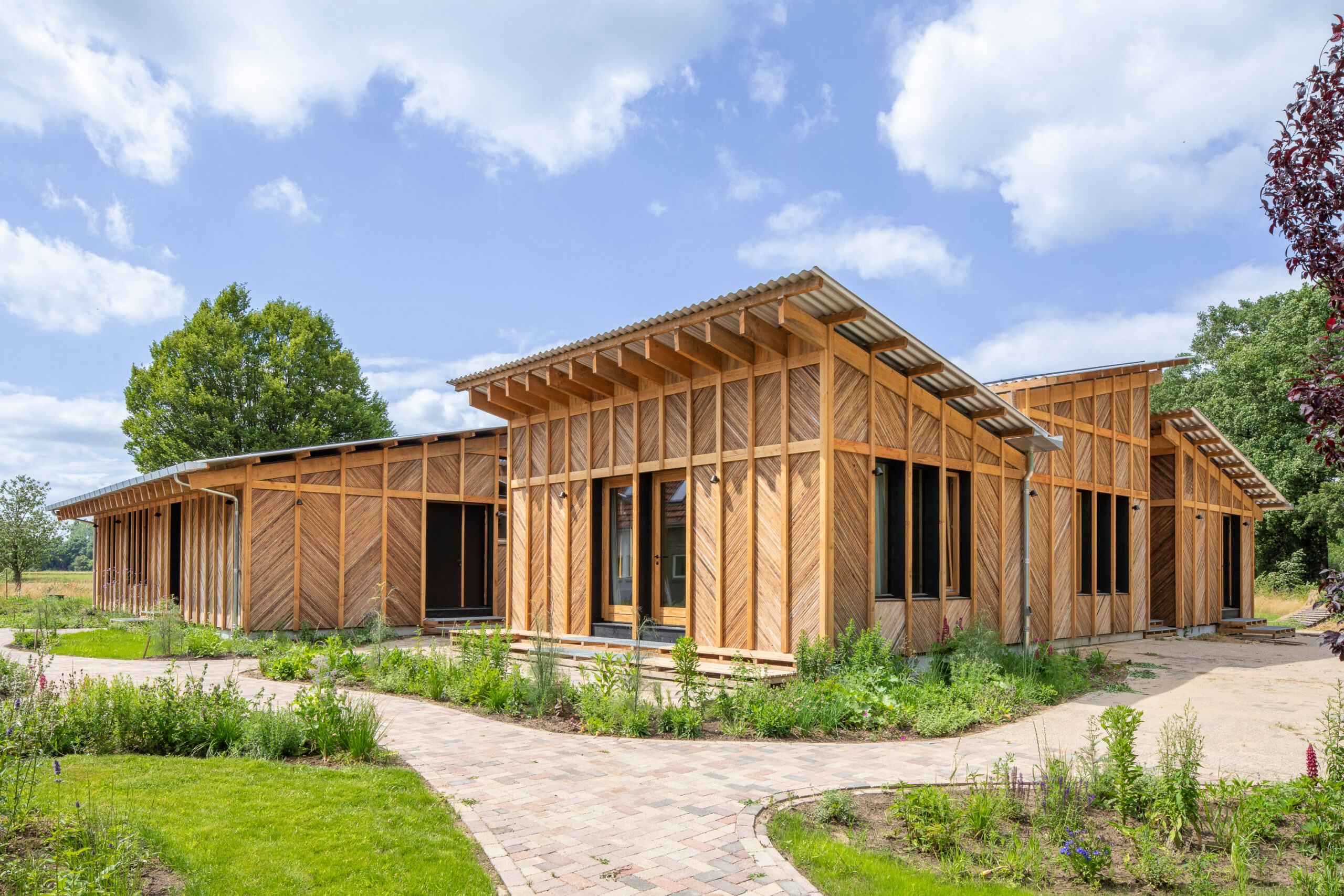 Voor de bouw is 160 kubieke meter lokaal geoogst douglashout gebruikt, afkomstig van landgoed Slangenburg, waar het retraitecentrum is gevestigd. De gevels zijn bekleed met 14.500 hergebruikte fraké-latten uit een reststroom van houtverduurzamer Platowood. Vloeren, wanden en daken zijn geïsoleerd met 15.000 kilogram stro en miscanthus, geteeld door een collectief van zes boeren uit de regio. Het project geldt als voorbeeld voor een volledig regionale, circulaire bouwketen.
